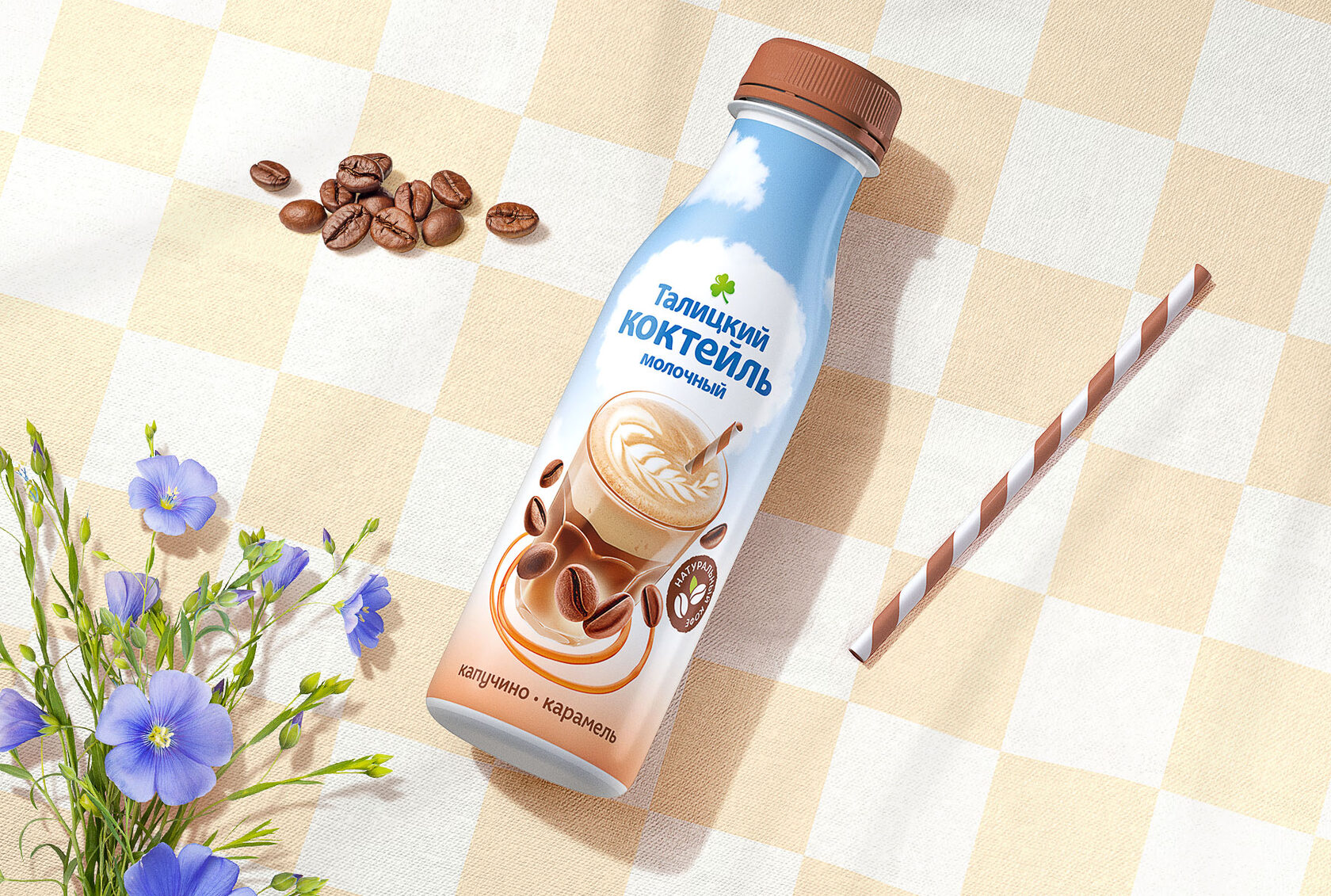Несмотря на каноничный для бренда дизайн упаковки с нежными пастельными градиентами и пушистыми облаками на фоне, линейка выглядит более праздничной и яркой, благодаря выразительной, эффектной фуд-зоне. Панна котта привлекает внимание аппетитно стекающим топпингом и продуманным фуд-стайлингом, а стаканчик воздушного коктейля закружился в вихре компонентов напитка и дополнен полосатой соломинкой.