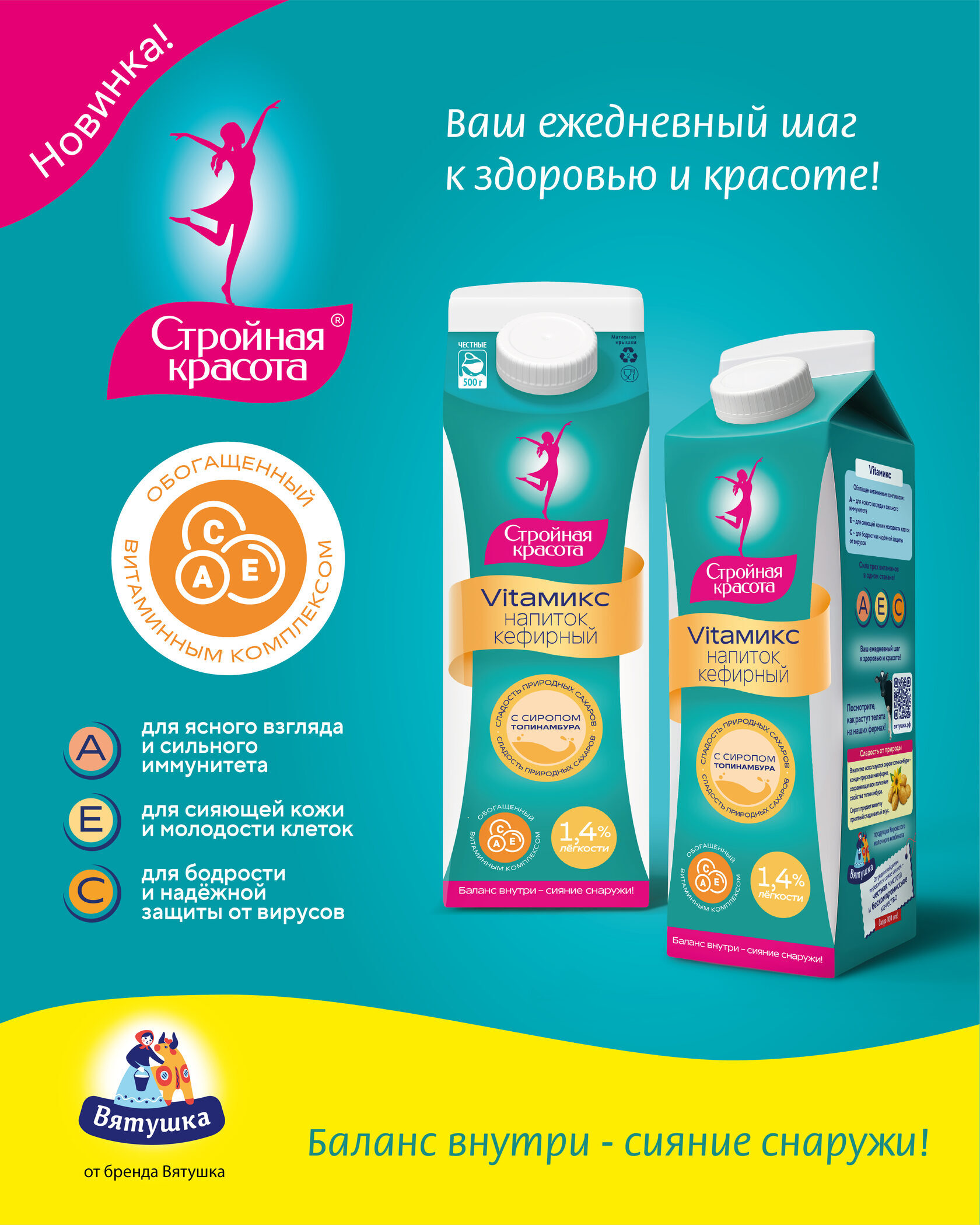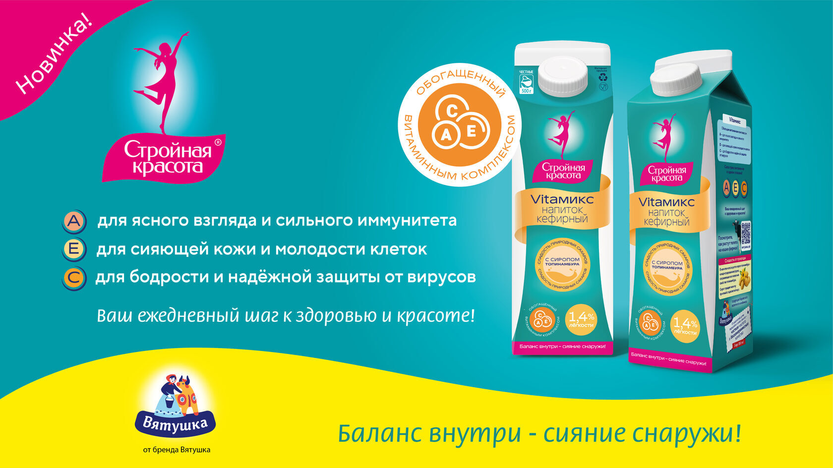 Новинка от «Вятушки» — кефирный напиток Vitaмикс «Стройная красота» с витаминами A–C–E и сиропом топинамбура.